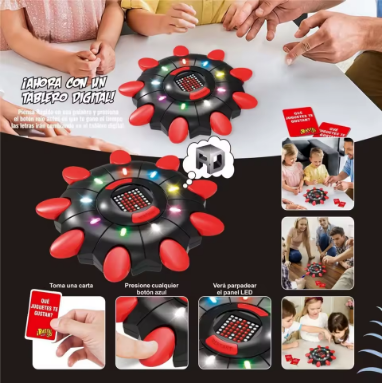 El tablero combina colores negro y rojo, con botones grandes y fáciles de presionar, ideal para niños y adultos. Las luces LED cambian según el tiempo, haciendo el juego más dinámico y competitivo.