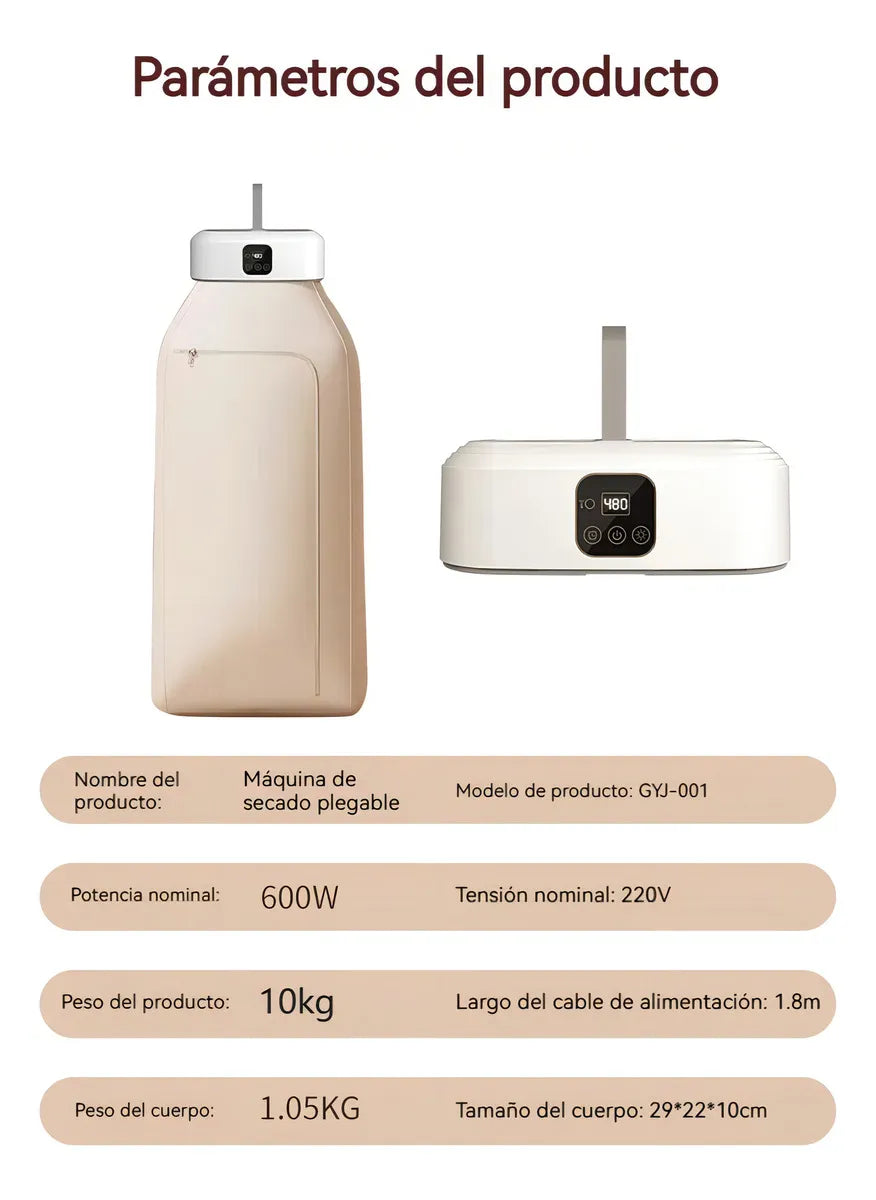 Secador colgante portátil, ideal para secar ropa de manera rápida, eficiente y segura. Con 600W de potencia y capacidad para hasta 10 kg de prendas, seca desde ropa diaria hasta edredones y zapatos en minutos.