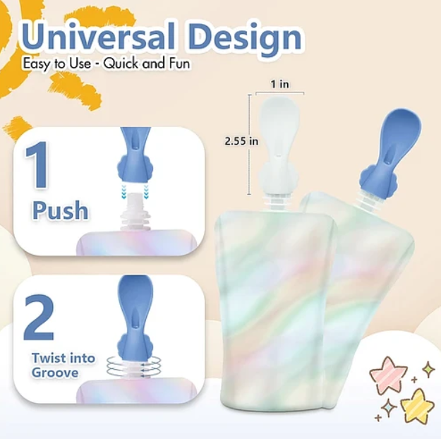 Con su diseño de compresión fácil de usar, puede controlar fácilmente el flujo de alimentos y alimentar a su bebé con facilidad. La cuchara de silicona adjunta hace que la alimentación sea aún más cómoda. Simplemente gire el accesorio de la cuchara a la bolsa de comida y estará listo. La cuchara suave y flexible es suave para las encías de su bebé y permite una fácil alimentación.