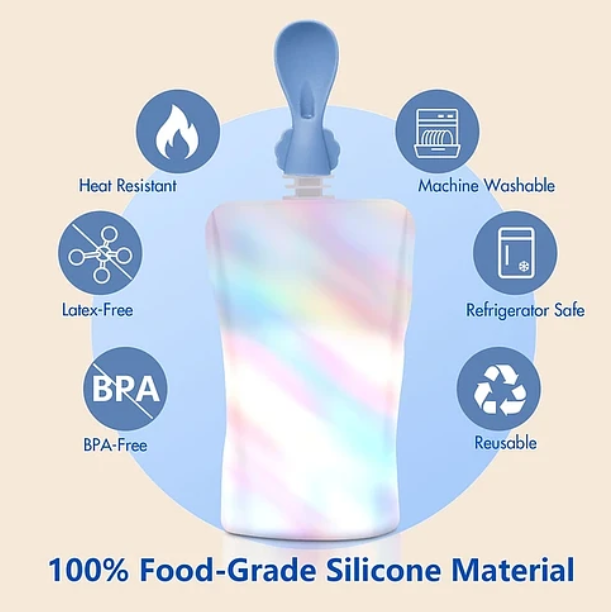 Fabricada con silicona de alta calidad, esta combinación de bolsa de comida y cuchara está diseñada para facilitar la alimentación mientras se mantiene a raya el desorden. Ya sea que esté en casa o fuera de casa, nuestra bolsa de alimentos de silicona a prueba de fugas garantiza que la comida de su bebé permanezca sellada de forma segura. Ya no te preocupes por derrames y fugas en tu bolso o pañalera.